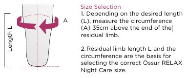 The Relax Night Care Sock is available in one standard length (35cm). The sock can be carefully sewn over for residual limbs < 30cm.