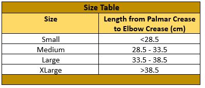 Size Guide – Measure length (cm) from the palmar crease to the elbow crease.