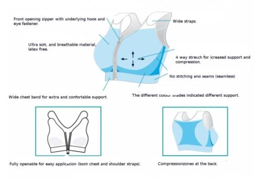 - Different compression zones designed in the bra helps to reduce the risk of edema and post-surgical complication. B